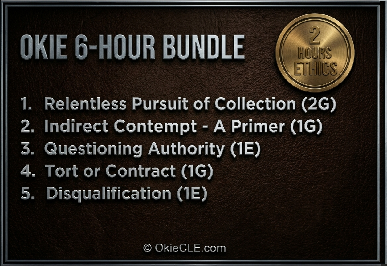 The Relentless Pursuit of Collections General Oklahoma CLE (2-Hours)-2026 $70 Tort or Contract? 1-Hour Oklahoma CLE-2026 $40 Oklahoma Ethics CLE-2026 $40 Indirect Contempt of Court - 1G-2026 $40 Conflicts of Interest and Disqualification $40